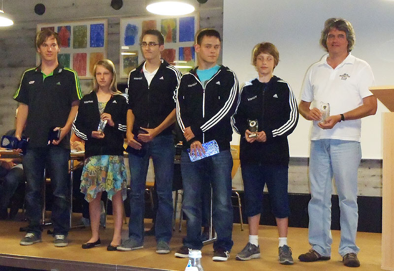 Die Sportler mit den Trainern Armin und Achim sowie dem Bezirksvorsitzenden Walter Happle.
